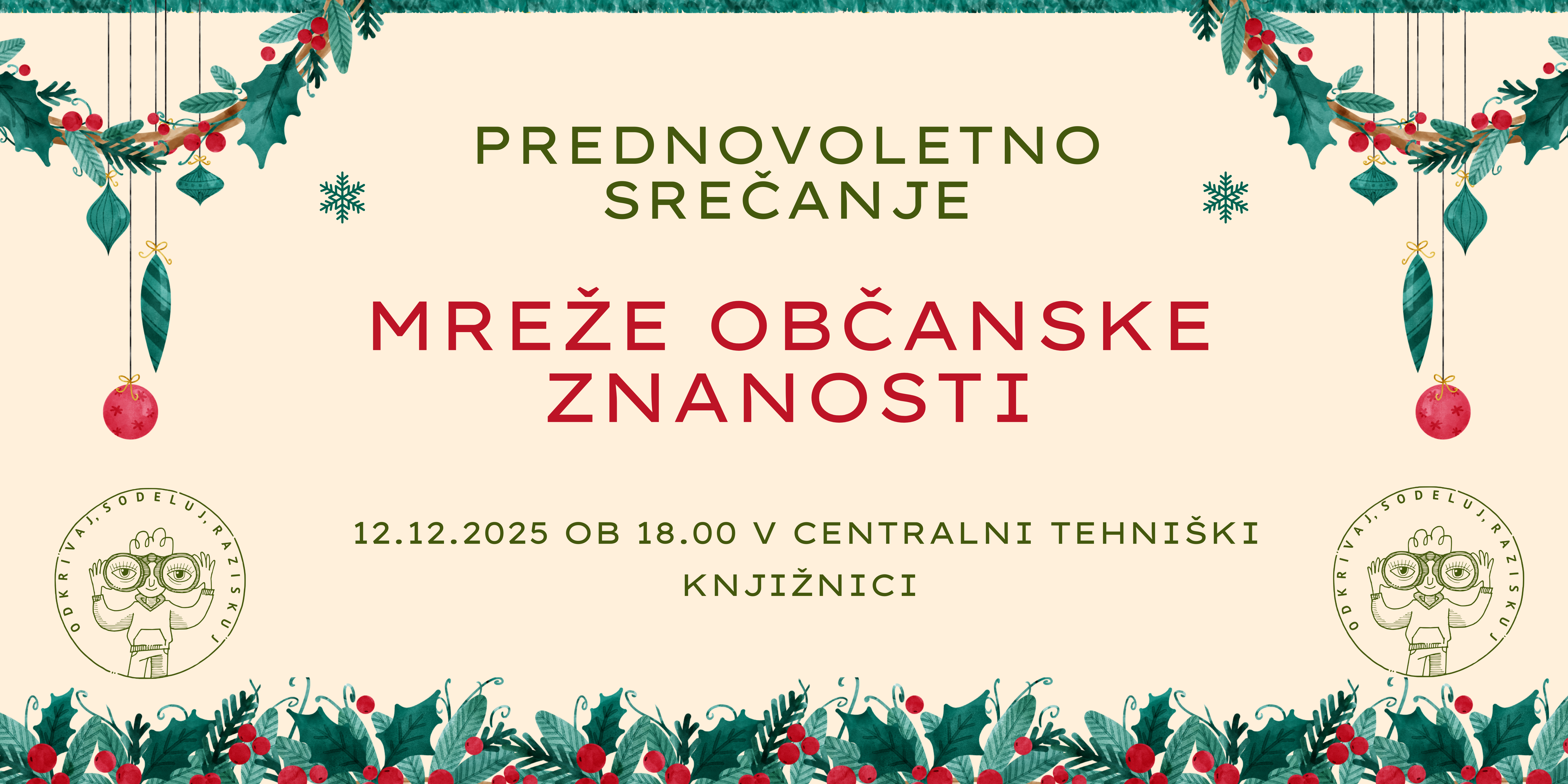 Mreža občanske znanosti tudi letos organizira že tradicionalno družabno prednovoletno srečanje, ki ponuja možnost za zanimive pogovore v sproščenem vzdušju ob glasbi in pogostitvi.